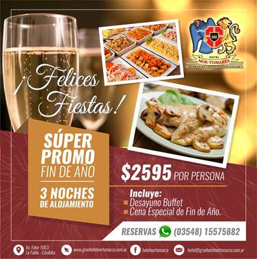 En La Falda, el Hotel Nor Tomarza ofrece una promoción con una estadía de tres noches a 2595 pesos por persona para las celebrar año nuevo, con desayuno buffet y cena de fin de año. Las tarifas son para habitaciones base doble o triple, tanto la habitación tiene un recargo de 30%.
