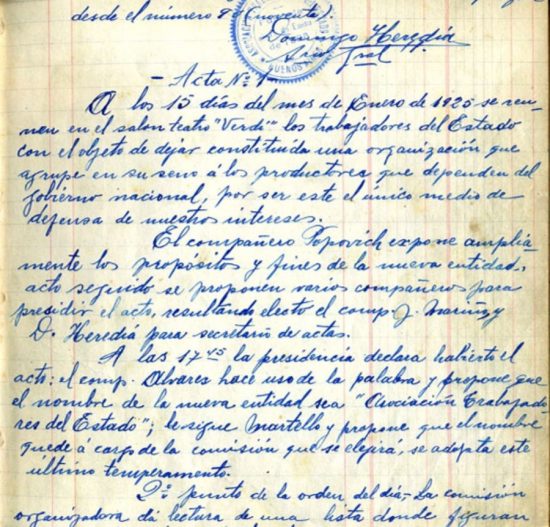La tarde del 15 de enero de 1925, en el ya mítico Teatro Verdi del barrio de La Boca, más de un centenar de herreros, carpinteros, mecánicos, torneros, peones de patio y fundición, electricistas, albañiles, marineros y foguistas de las dragas se juntaron y fundaron una organización para la defensa de sus intereses. Un compañero llamado Álvarez se paró y propuso un nombre: Asociación de Trabajadores del Estado.