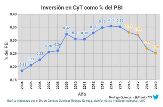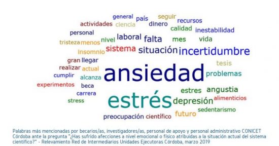 Todo esto ha minado la capacidad del CONICET de promover la producción científica, el desarrollo tecnológico y la innovación en procesos productivos, mientras que muchos institutos apenas alcanzan a cubrir sus gastos básicos de servicios, higiene y seguridad. Ante esta realidad, las condiciones de trabajo y la calidad de vida de los trabajadores de CyT en el país se deterioran cada vez más. Una encuesta realizada por la Red de Intermediarios de Unidades Ejecutoras Córdoba revela que el 70,3% del personal de CONICET en la ciudad ha sufrido afecciones emocionales o físicas atribuidas a la situación actual del sistema científico.