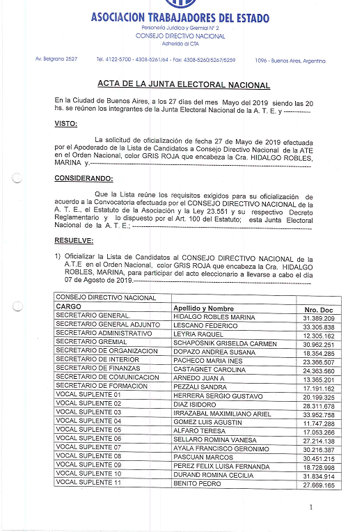A su vez, la Gris Roja lleva como candidata a secretaria General a la compañera Marina Hidalgo Robles, en tanto Federico Lescano se la acompaña como Adjunto.