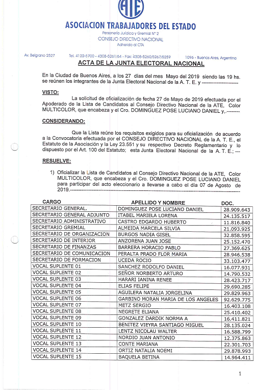 Por su parte, la lista Multicolor lleva como candidato a secretario General a Luciano Dominguez Pose y como Adjunta a la compañera Mariela Itabel.