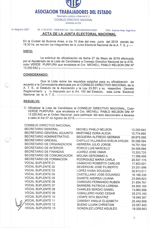 En tanto, la lista Verde Púrpura presenta a Pablo Micheli como candidato a secretario General y a Dora Martínez como Adjunta.