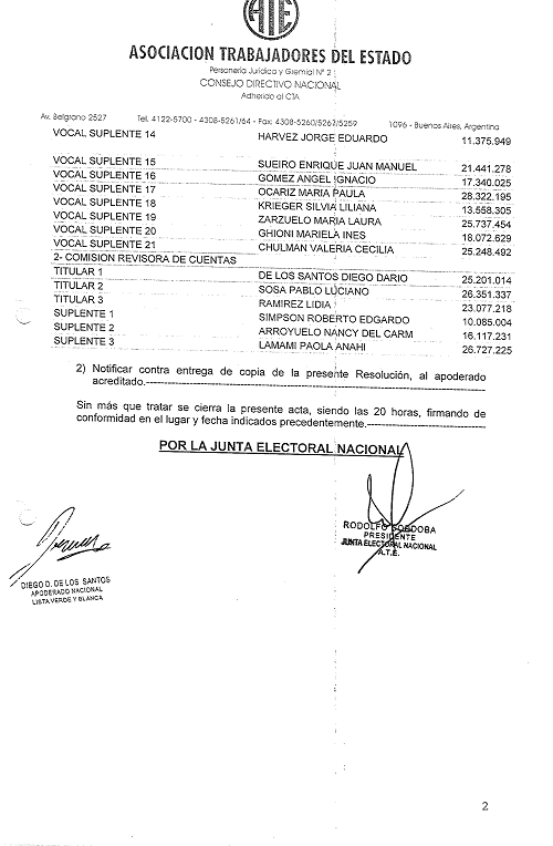 En primer término, la lista Verde de la agrupación Anusate, que fundaran Germán Abdala, Victor De Gennaro, Héctor Quagliaro y Oscar Mengarelli entre otros compañeros históricos de ATE, lleva como candidatos a Hugo Cachorro Godoy, que va por la reelección, acompañado por el secretario General de ATE Río Negro, Rodolfo Aguiar.