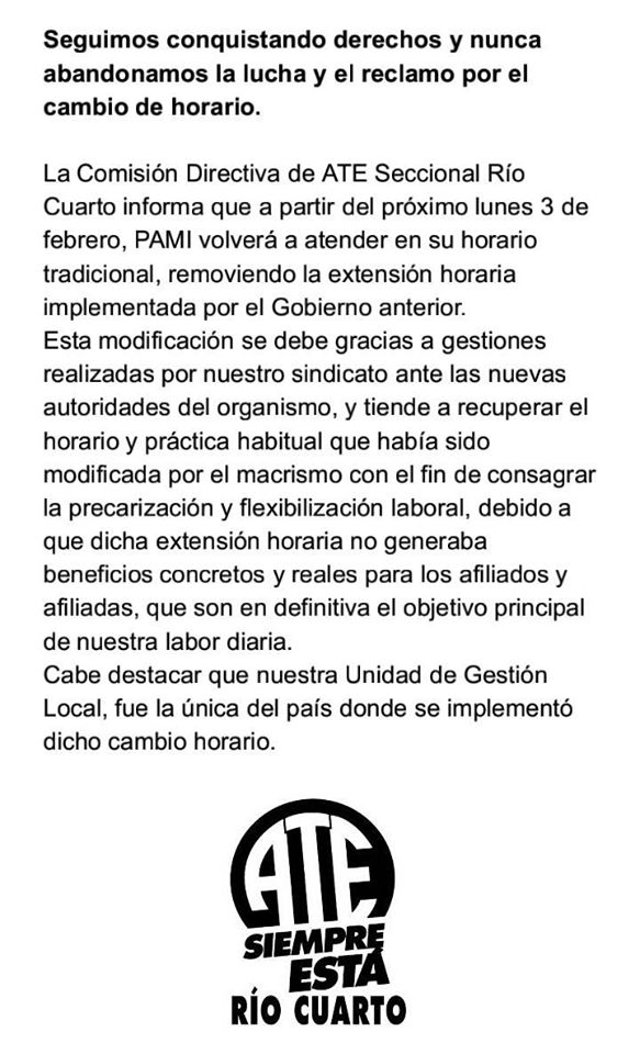 “La Comisión Directiva de la Asociación Trabajadores del Estado (ATE-CTA) Seccional Río Cuarto, informa que a partir del próximo lunes 3 de febrero, PAMI volverá a atender en su horario tradicional, removiendo la extensión horaria implementada por el Gobierno anterior.