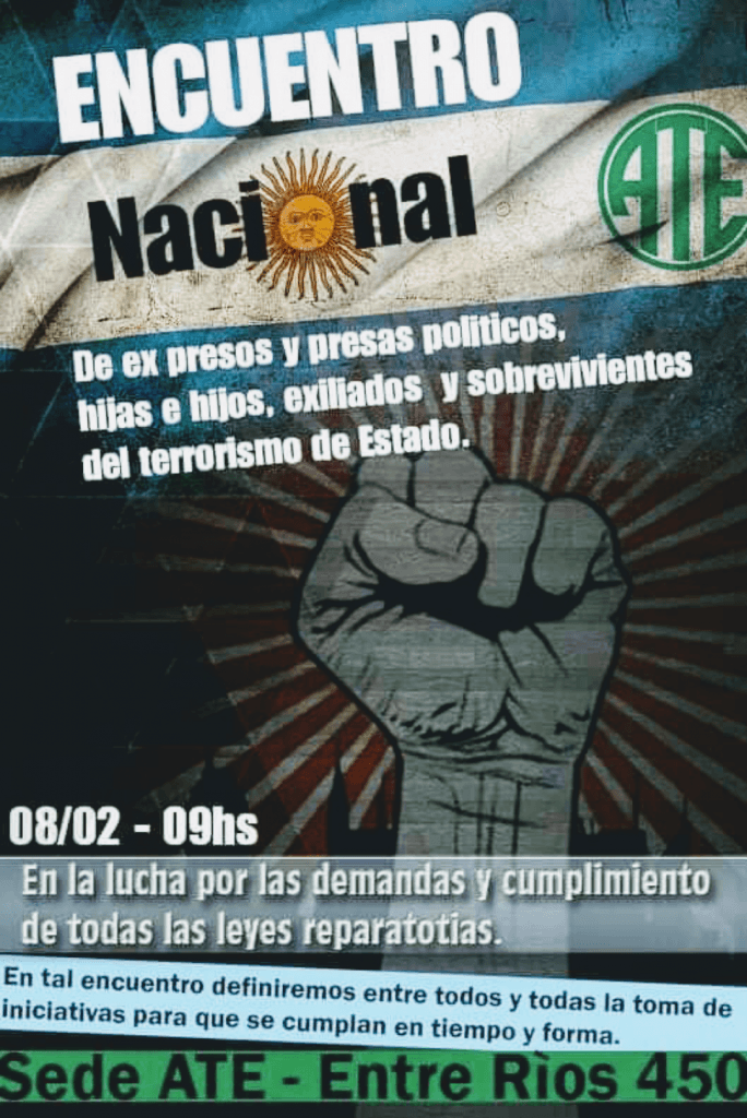 El próximo sábado se realizará el Encuentro Nacional de Ex-Presos Políticos, Víctimas, Sobrevivientes, Hijos y Exiliados del Terrorismo de Estado en la sede del CDP Córdoba de ATE. Se debatirá sobre Derechos Humanos en general y sobre el estado actual de implementación de las leyes reparatorias. Habrá presencia de compañerxs de provincias de todo el país.