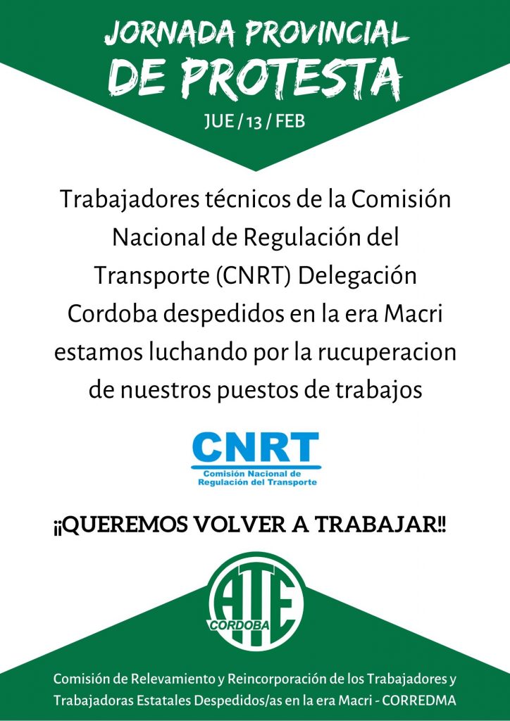 Este jueves 13 de febrero, se llevó adelante una Jornada Provincial de lucha en los diferentes organismos nacionales con sede en la Provincia de Córdoba, que despidieron trabajadores y trabajadoras durante el ajuste macrista.