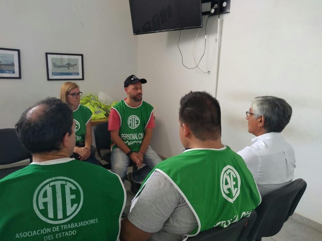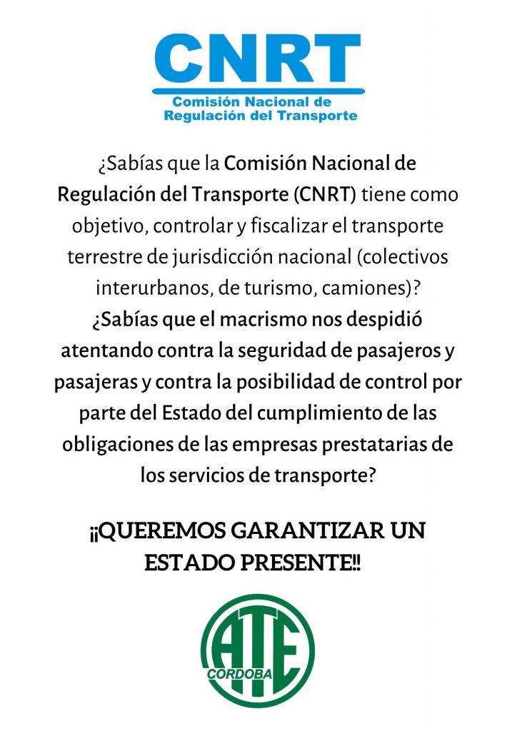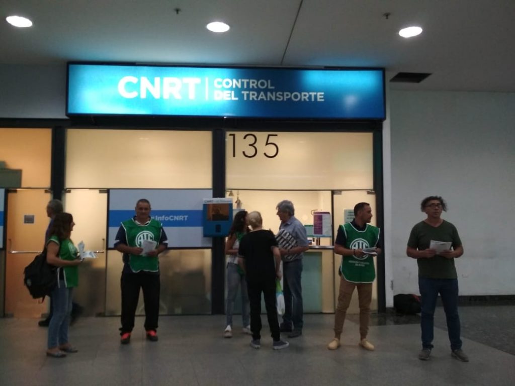 También en horas de la mañana en la Terminal de Ómnibus de la ciudad de Córdoba, se realizó una volanteada de los despedidos/as por la Comisión Nacional de Regulación del Transporten (CNRT). Quienes fueron dejadxs sin trabajo fueron acompañadxs por una representación del CDP de ATE compuesta por María Sotti, César Theaux y Estela Corzo.