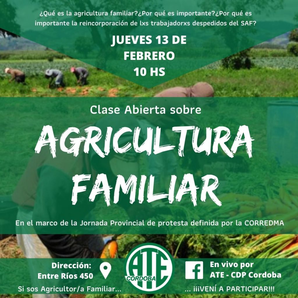 En simultáneo a ambas acciones, también en la ciudad de Córdoba, desde las 10 horas las y los despedidos de la SAF (Secretaria de Agricultura Familiar), dictaron una clase pública en la sede de ATE (Entre Ríos 450) sobre soberanía alimentaria. La misma fue transmitida en vivo mediante straming en las redes sociales del CDP de ATE Córdoba, para todo el mundo.