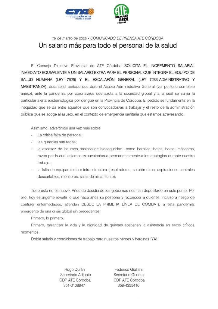 El Consejo Directivo Provincial de ATE Córdoba SOLICITA EL INCREMENTO SALARIAL INMEDIATO EQUIVALENTE A UN SALARIO EXTRA PARA EL PERSONAL QUE INTEGRA EL EQUIPO DE SALUD HUMANA (LEY 7625) Y EL ESCALAFÓN GENERAL (LEY 7233-ADMINISTRATIVO Y MAESTRANZA), durante el período que dure el Asueto Administrativo General (ver petitorio PRESENTADO HOY completo, anexo), ante la pandemia por coronavirus que azota a la sociedad global y a la cual se suma la particular alerta epidemiológica por dengue en la Provincia de Córdoba. El pedido se fundamenta en la inequidad que se da entre aquellos que son convocados/as a trabajar y el resto de la administración pública que se acoge al asueto, en el contexto de emergencia sanitaria que estamos atravesando.