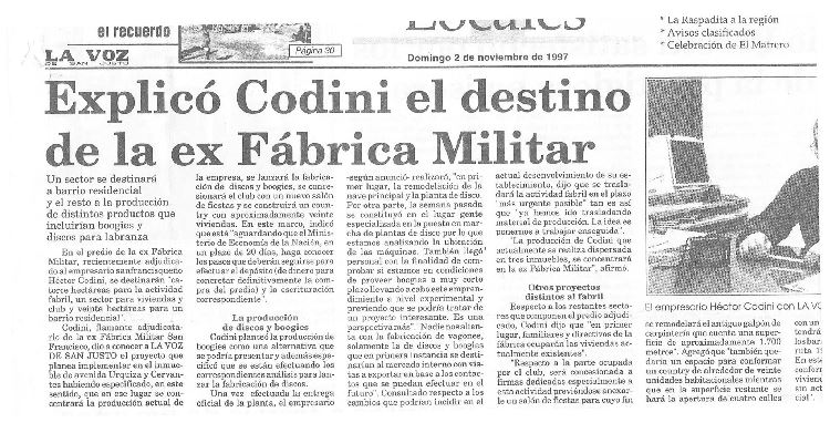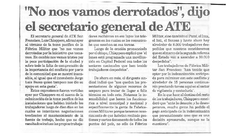 Con la llegada de un director civil en la Fábrica Militar San Francisco recordó que “nos había informado que el proceso iba a desembocar como una verdadera aplanadora como finalmente ocurrió con el cierre de la fábrica y posterior privatización”.