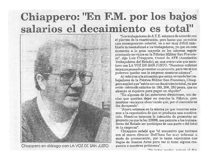 A diferencia de San Francisco, en las fábricas militares de esas ciudades “no se cambió el proceso productivo”, dijo Luis Chiappero, que dirigió la Seccional local de la Asociación Trabajadores del Estado (ATE-CTA) y en ese rol encabezó junto al histórico dirigente sindical Víctor De Gennaro, el proceso de resistencia que desembocó en el previsible final hace 22 años.