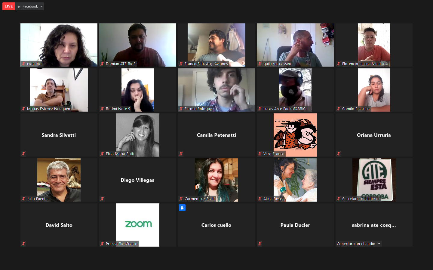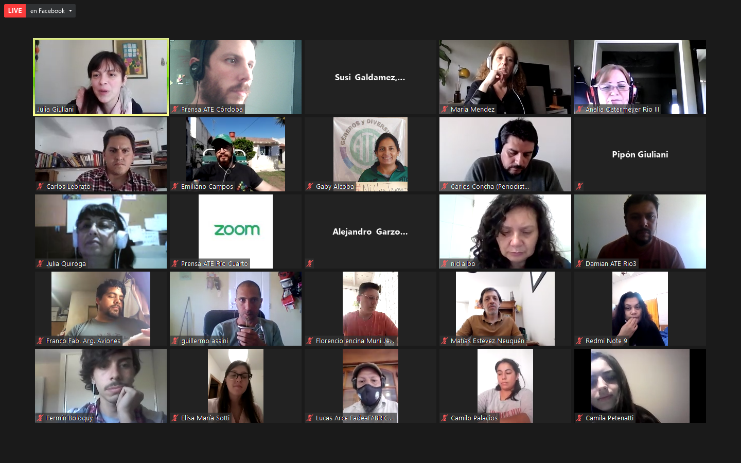 De la reunión participaron, también, el presidente de CLATE, Julio Fuentes, Alejandro Garzón, Secretario Gremial del Consejo Directivo Nacional de ATE, Federico Giuliani, Edith Innamorato y María Sotti, Secretarias/o General, del Interior y de Actas del CDP de ATE Córdoba (respectivamente); Alejandra Silvetti de ATE Rosario, Alicia Rivas de ATE Misiones, Julia Quiroga de ATE San Juan, las y los Secretarios Generales, Gremiales y de Prensa de las Seccionales de ATE Córdoba: Damián Albornoz, David Salto y Emiliano Campos (Río Tercero), Rafaela Alcoba, Pablo Irusta (Río Cuarto), Diego Villegas (Adelia María). Además, participaron trabajadoras y trabajadores afiliados a ATE de las municipalidades de Cosquín, Almafuerte, Jesús María y despedidos de FADEA por el macrismo. La transmisión en vivo por Facebook fue seguida por compañeros/as de Entre Ríos, Chubut, Misiones, Neuquén y de otro puntos de Latinoamérica como Chile, Uruguay y El Salvador.
