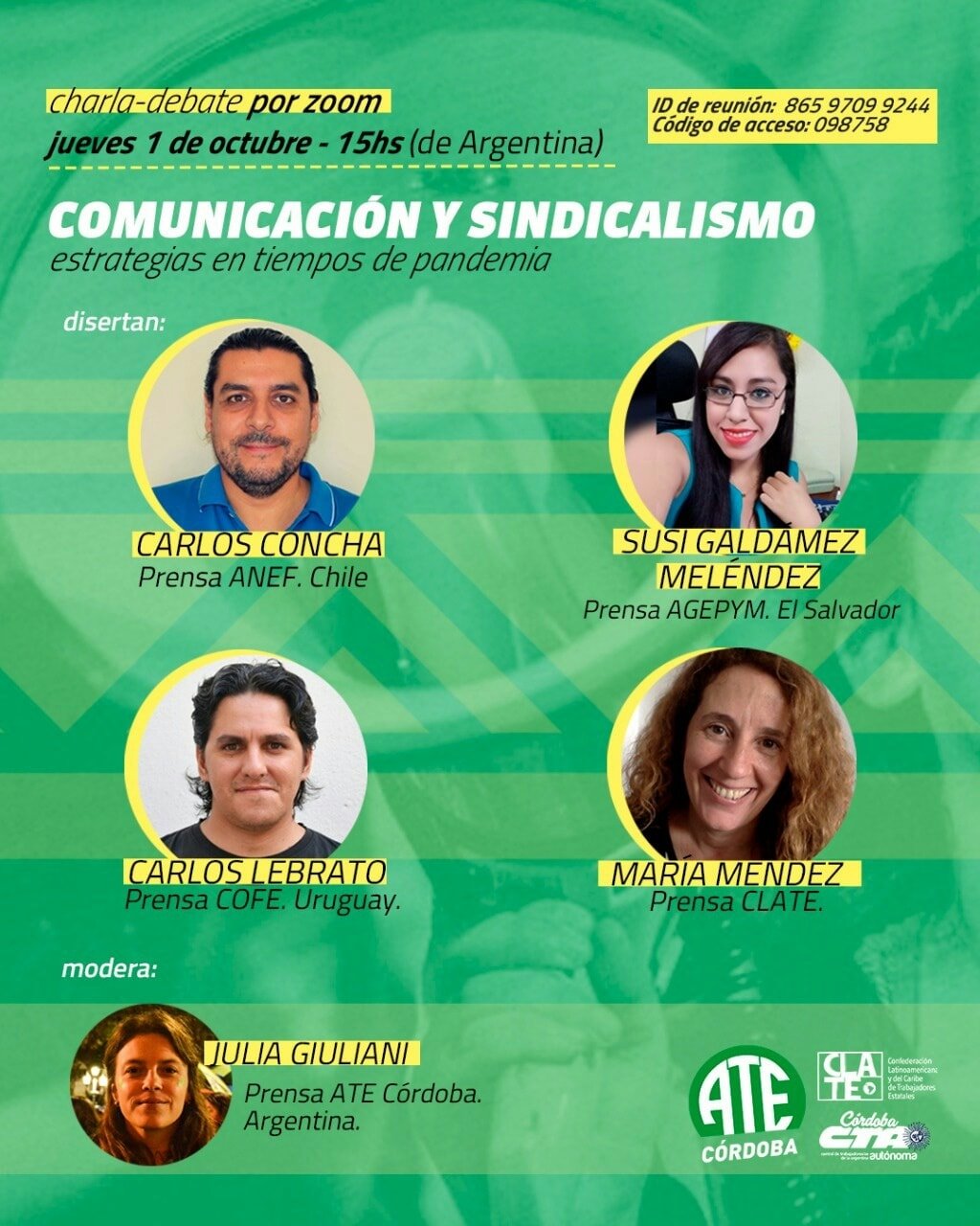 Las y los expositores en la instancia fueron: Carlos Concha de Prensa de la Agrupación Nacional de Empleados Fiscales (ANEF) Chile; Susi Galdámez Meléndez de la Asociación General de Empleados Públicos y Municipales (AGEPYM) de El Salvador; Carlos Lebrato de Prensa de la Confederación de Organizaciones de Funcionarios del Estado (COFE) de Uruguay; y María Méndez, Secretaria de Prensa de CLATE.