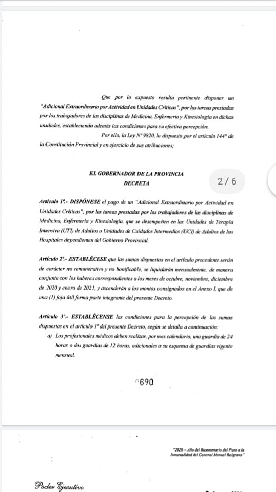 Este decreto determina el pago de sumas diferenciadas entre estos profesionales, generando injustas diferencias entre distintas disciplinas, a cambio de una mayor contraprestación horaria en el hospital donde tienen el cargo o donde el Ministerio de Salud así lo disponga. Por lo que no resulta un reconocimiento al esfuerzo realizado tras duros meses de trabajo en la pandemia ni una recomposición por la pérdida de poder de compra de nuestros haberes frente a la inflación.