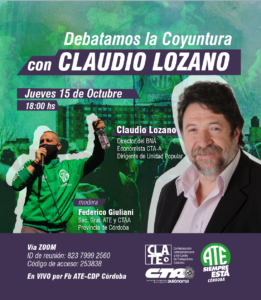 En un debate que contó con la moderación de Federico Giuliani, Secretario General del Consejo Directivo Provincial (CDP) de la Asociación Trabajadores del Estado de Córdoba, Claudio Lozano expuso los principales puntos que componen la coyuntura económica y política actual y los elementos que llevaron al estado actual de situación de nuestro País en general, el Gobierno en particular, la estrategia de los sectores populares para retomar la iniciativa y las medidas indispensables en ese marco de construcción de una agenda popular a nivel gubernamental. En este último sentido, Lozano remarcó que “para acordar políticas, cuestiones económicas, debe de haber pelea antes.