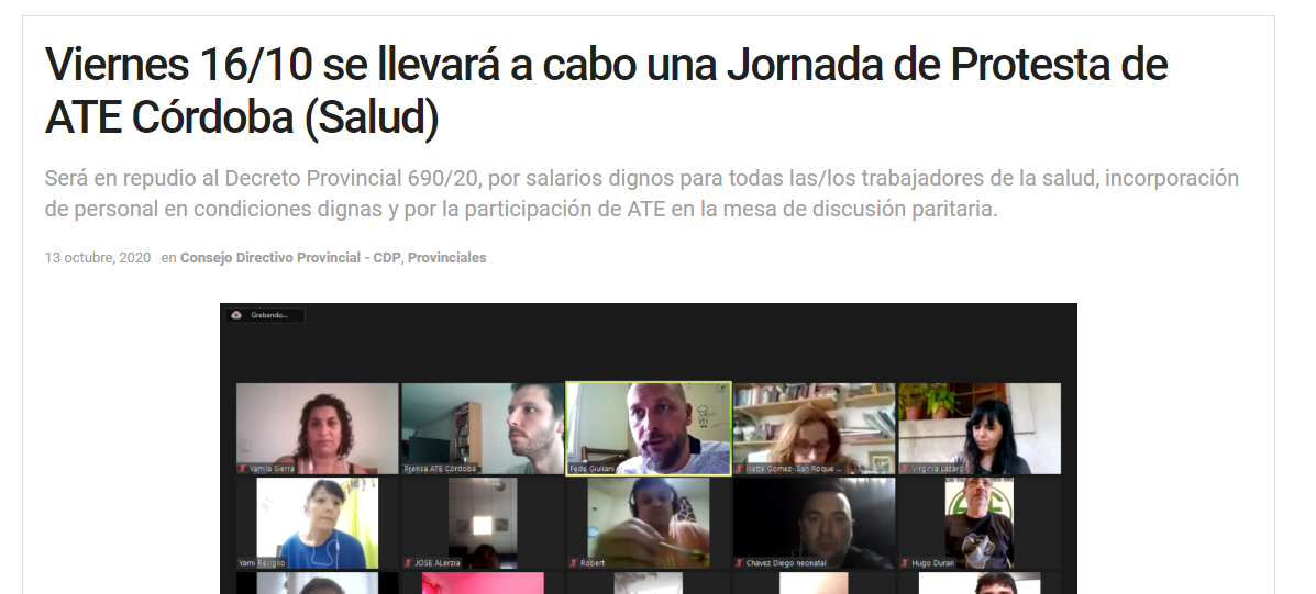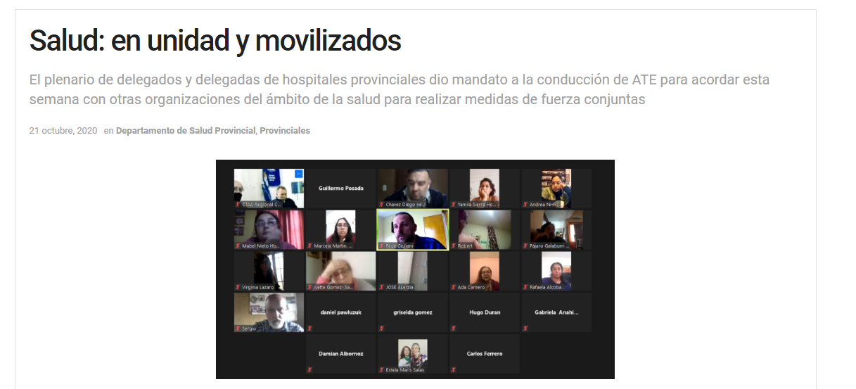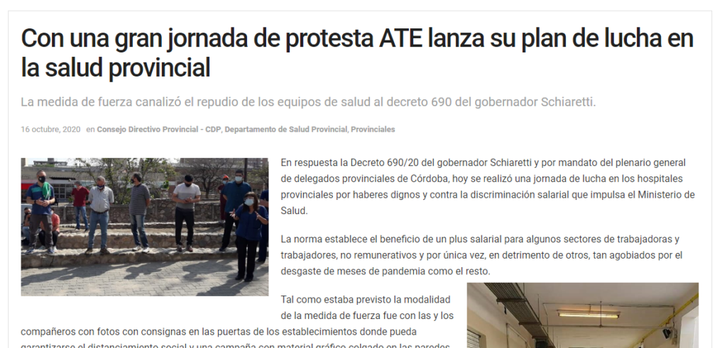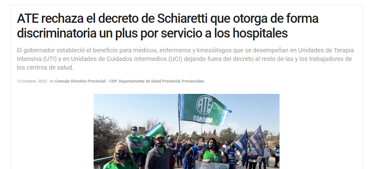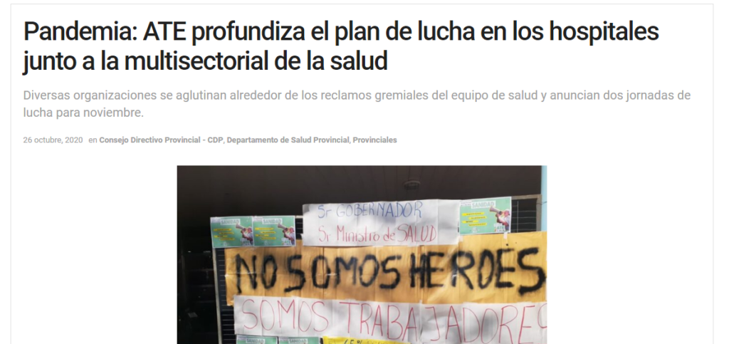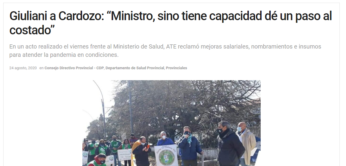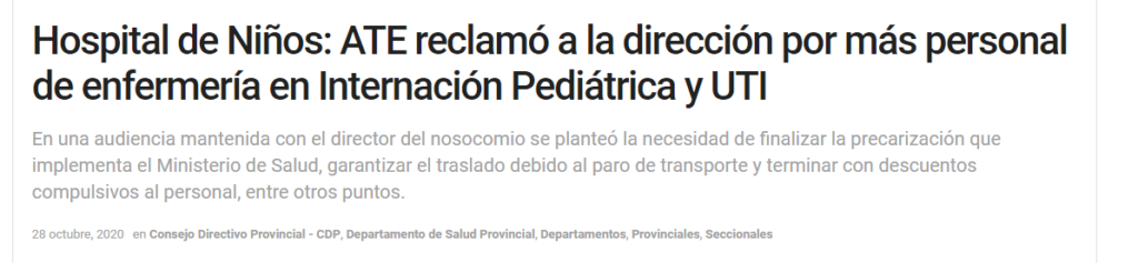 “La pelea tiene varios planos. Debemos recordar la cantidad de acciones que ATE llevó a cabo: caravanas con otros gremios, corte de la avenida Vélez Sarsfield, frente al Ministerio, acto en el puente de la avenida Sabatini en Polo Sanitario y presentaciones administrativas varias. Nunca obtuvimos las medidas reclamadas y nos parece importante sumar a la Legislatura, que también tiene responsabilidad en esta situación, por acción u omisión, en este colapso del sistema de salud”.