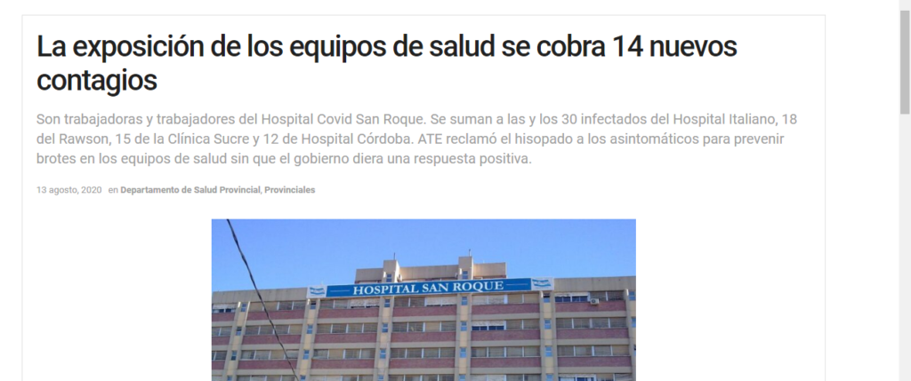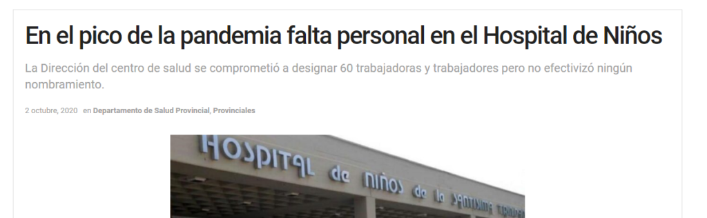 “Ante ese marco –prosiguió Giuliani- la primera línea de salud viene muy desgastada. Desde marzo que no descansa, con el grave impacto físico y emocional que importa. Ya pusimos 13 muertos en lo que va de la pandemia, más todos los contagiados. Por eso urge que el Gobierno provincial comience a incorporar más personal capacitado. Pero a esas incorporaciones hay que pagarlas con buenos sueldos, dándole además estabilidad laboral, proveyéndolos de Equipos de Protección Personal y elementos de bioseguridad y prevención”.
