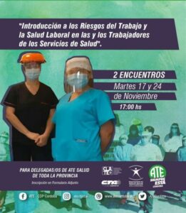 El Departamento de Salud Laboral del Consejo Directivo Provincial (CDP) de ATE Córdoba comenzará hoy martes a las 17 horas, un taller de formación virtual denominado “Introducción a los Riesgos del Trabajo y la Salud Laboral en las y los Trabajadores de los Servicios de Salud”, destinado a los integrantes de equipos sanitarios del ámbito nacional, provincial y municipal de nuestra provincia.