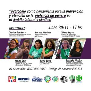 La actividad, que se desarrollará entre 17 y 19 horas, contará con las expositoras Silvia León, secretaria de Género CTA-A Nacional, Clarisa Gambera, directora del Departamento de Género y Diversidad ATE Nacional, Lorena Almirón, secretaria General de ATE Rosario, y María Sotti (Secretaria de Actas y Directora del Departamento de