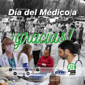 Por el aporte a la salud de los pueblos, por la lucha y el empeño diario, aún cuando los gobiernos y prestadores privados pretenden considerarles un factor más del negocio de la medicina, es que hoy les saludamos y agradecemos: ¡Vamos juntos y juntas por una salud popular de vanguardia que respete a sus trabajadores y trabajadoras!