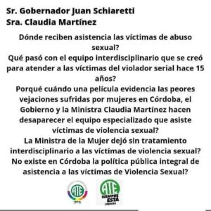 Allí denunciaron que “ante el estreno de la película que cuenta el caso real de un violador serial en la ciudad de Córdoba, queremos visibilizar como se ha destruido el equipo de apoyo a las víctimas de violencia sexual. 15 años después de los sucesos que muestra la película, quienes trabajan en el sector no tienen estabilidad laboral, poseen contratos de 8 horas siendo totalmente insalubre. Instamos a la Ministra de la Mujer, Claudia Martínez, a explicar porque dejó sin tratamiento interdisciplinario a las víctimas de violencia sexual”.