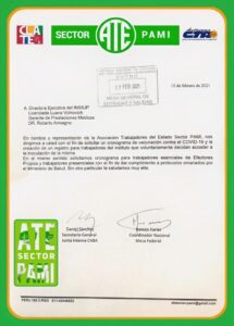 En una nota elevada el viernes pasado a la Directora Ejecutiva del PAMI, Luana Volnovich, el Consejo Directivo Provincial (CDP) y la Coordinación Nacional de ATE PAMI solicitaron que sea vacunada contra el Covid-19 la totalidad del personal del organismo.