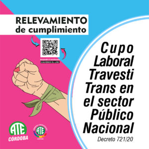 Así, desde la Asociación Trabajadores del Estado (ATE), Consejo Directivo Provincial (CDP) Córdoba, y en conjunto con los Departamentos de Discapacidad y de Géneros y Diversidades, ATE ha confeccionado dos “Cuestionarios de Relevamiento de Cumplimiento de Cupos” (Laboral Trans-Travesti y de Discapacidad), con la intención de que, sectorialmente, sean respondidos por una persona por organismo/institución (los LINKS se encontrarán al final de la nota). De esta manera, el sindicato pretende acceder a información para conocer el estado actual de cumplimiento de ambas reglamentaciones en nuestro Estado Nacional. Sin perjuicio de que los alcances formales y la obligación de las reglamentaciones mentadas sean exclusivamente para el Estado Nacional, sabemos desde ATE Córdoba que muchos Municipios y Organismos Públicos Provinciales disponen de reglamentaciones similares, con lo cual los “Relevamientos…” propuestos tendrán el alcance de todos los Estados en la Provincia de Córdoba. Además, quienes pertenezcan a organismos o instituciones públicas donde no haya este tipo de reglamentaciones, el relevamiento debe servir, también, como invitación a organizarse para luchar y crearlas.