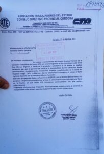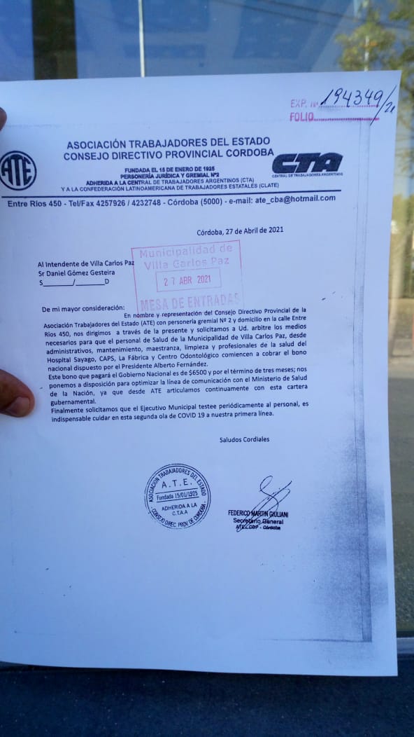Quienes trabajan en salud pública municipal en Villa Carlos Paz han estado expuestos y expuestas desde el primer día a la pandemia, batallando desde la primera hora contra el COVID. En virtud de ello, desde ATE Córdoba se le solicitó hoy al Intendente Municipal, Daniel Gómez Gesteira -mediante una misiva firmada por el Secretario General del sindicato, Federico Giuliani-, la gestión ante autoridades nacionales para el cobro del bono de $6500 destinado al personal de salud, anunciado por el Presidente de la Nación, Alberto Fernández. En ese sentido, ATE solicitó que se incluya en las listas de trabajadoras/es a cobrar a de todo el personal administrativo, de maestranza, mantenimiento, limpieza y profesional, de todas las reparticiones de salud dependientes del Municipio (Hospital Sayago, CAPS, La Fábrica y Centro Odontológico).