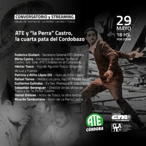 Federico Giuliani, Secretario General de ATE Córdoba, invitó a participar de la conmemoración del Cordobazo: “conmemoraremos un nuevo aniversario de esta gesta popular histórica que marcó a fuego la militancia en nuestra querida provincia y para ello organizamos una actividad repleta de sentimiento y compromiso”. La instancia se realizará a través de un conversatorio virtual “del que participarán compañeras y compañeros con un largo recorrido militante en nuestra querida Córdoba”, puntualizó Giuliani quien adelantó que en la instancia se realizará, también, la presentación de las obras de teatro de “Tosco” y “La Perra Castro, el olvidado”, dirigidas por Sebastián Berenguer. El Director de la obra, participará del conversatorio junto a los actores-intérpretes de ambos unipersonales, Daniel Dibiase (Agustín Tosco) y Ricardo Tamburrano (“La Perra” Castro). “Es un buen momento para reflexionar, debatir y disfrutar desde casa y por streaming ambas obras de Teatro”, expresó Giuliani.