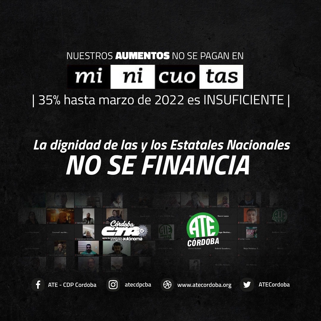 A partir de lo resuelto en el plenario general de delegados y delegadas del Estado nacional en Córdoba, que se llevó a cabo el pasado 1º de junio, ATE Córdoba convocó para mañana a una jornada provincial de protesta de los organismos nacionales, a los fines de reclamar la reapertura de paritarias para alcanzar una verdadera recomposición salarial, habida cuenta que se declaró insuficiente la pauta del 35% otorgada por el gobierno nacional.