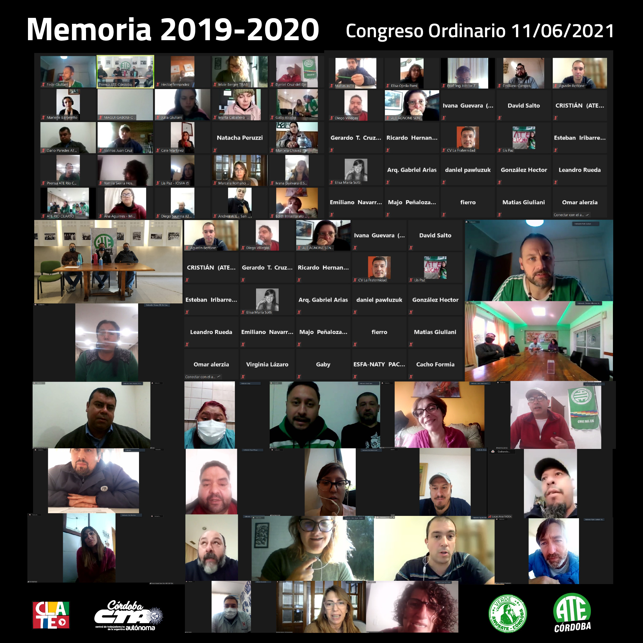 Esta mañana se realizó la presentación de la Memoria 2019-2020 del Consejo Directivo Provincial de ATE Córdoba. De la instancia participaron más de 60 representantes de ATE de toda la Provincia e hicieron uso de la palabra, tras el marco general brindado por el Secretario General de ATE Córdoba, Federico Giuliani, unos 25 referentes, entre ellas/os los/las Secretarios/as Generales de las Seccionales de Río Tercero (Damián Albornoz y David Salto), Río Cuarto (Rafaela Alcoba), Adelia María (Diego Villegas) y Cruz del Eje (Daniel Allende) y los máximos representantes de las delegaciones de Traslasierra (Jorge Hugo Galaburri) y San Francisco (Darío Paredes). Además, también expusieron el trabajo realizado durante el año pasado, las y los referentes de los Departamentos de Géneros y Diversidades (Rafaela Alcoba), Salud Laboral (Matías Giuliani), Nacionales (Agustín Bertone), Discapacidad (Franco Orsato), Asuntos Municipales y Salud Provincial (Gabriela García); hicieron lo propio quienes conducen las distintas Secretarías del Consejo Directivo Provincial: Adjunto (Hugo Durán), Finanzas (Ricardo Reyna), Administrativa (Matías Ávila), Prensa (Julia Giuliani), Formación (César Theaux), Gremial (Daniel Pawluchuzk), Actas (María Sotti), Organización (Omar Alerzia). La presentación contó con la presencia y la palabra, también, de Lucas Arce, referente de la Comisión para el Relevamiento y la Reincorporación de Despedidas y Despedidos de la era Macri (CORREDMA), despedido de FAdeA, y de Marcela Romano, del Consejo Directivo Nacional de ATE y del espacio de Universidades del sindicato.