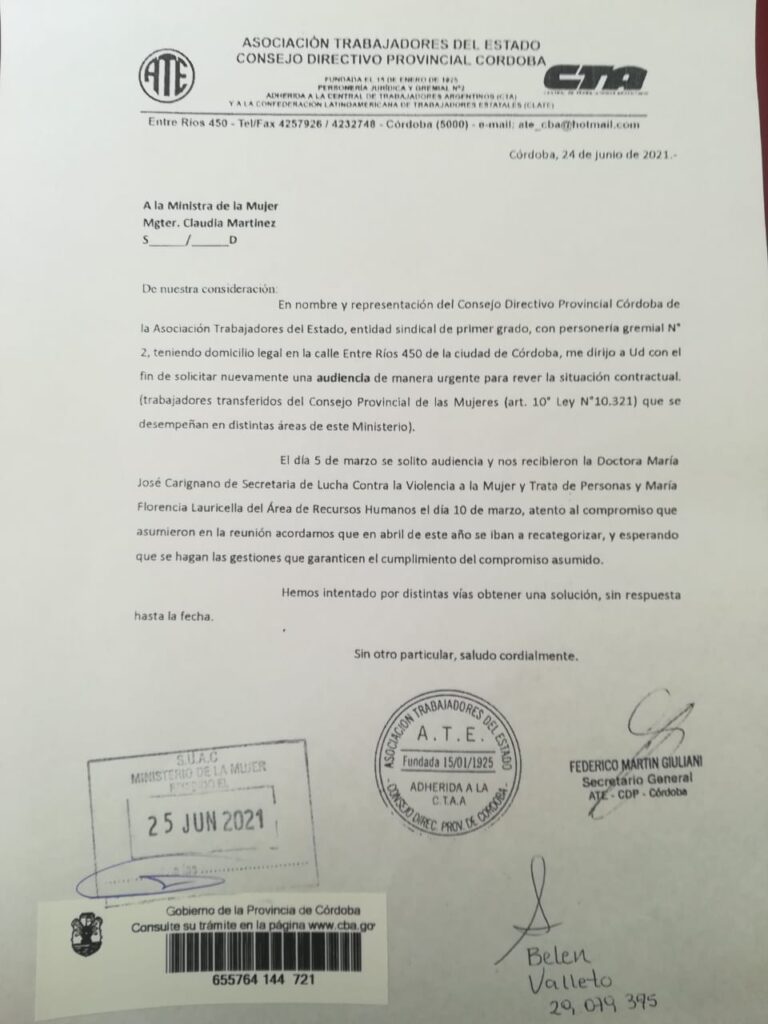 El jueves pasado el Consejo Directivo Provincial (CDP) solicitó una audiencia oficial con la titular del Ministerio de la Mujer de Córdoba, Claudia Martínez.