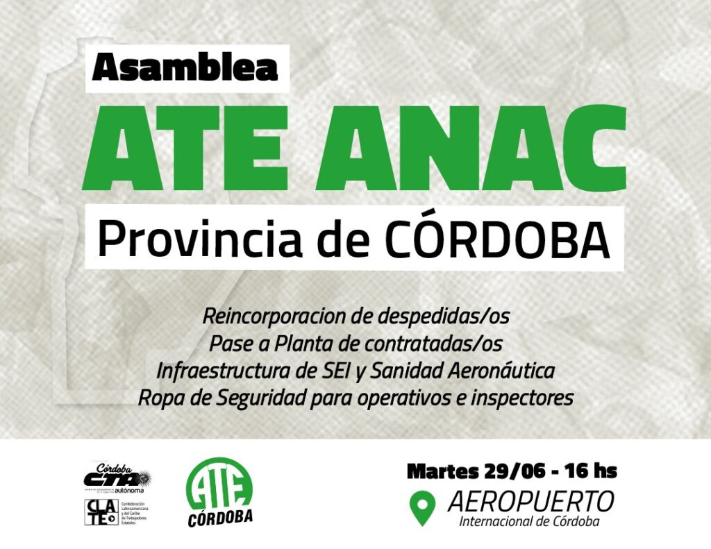 Como resultado de la falta de renovación de dos contratos a nivel nacional, sumado a la falta de personal en diversos servicios operativos a nivel local y a medidas arbitrarias contra la acción gremial de ATE en el Aeropuerto Córdoba, las y los trabajadores de la Administración Nacional de Aviación Civil (ANAC) realizará hoy una asamblea general en el Aeropuerto Córdoba, con movilización al ingreso del lugar.