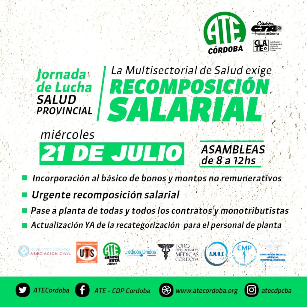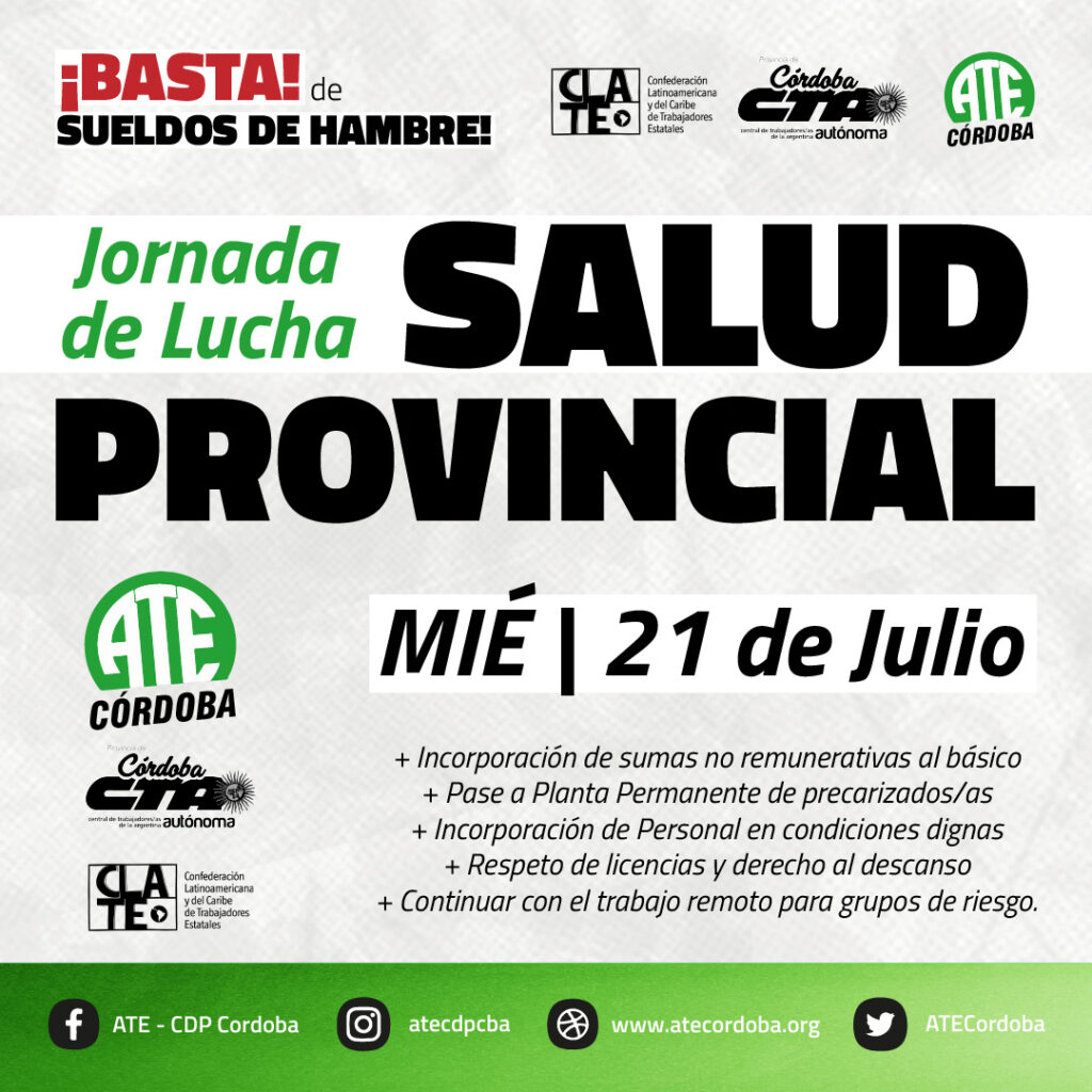 En el día de hoy, cumplimentando el mandato del Plenario Provincial de Delegadas y Delegados de Hospitales realizado el día de ayer, y en consonancia a lo dispuesto por la Multisectorial de la Salud de Córdoba, ATE ha realizado Asambleas en la mayoría de los Hospitales de la Provincia donde tiene presencia con el objetivo de garantizar la medida del próximo miércoles 21 de julio, de 8 a 12.