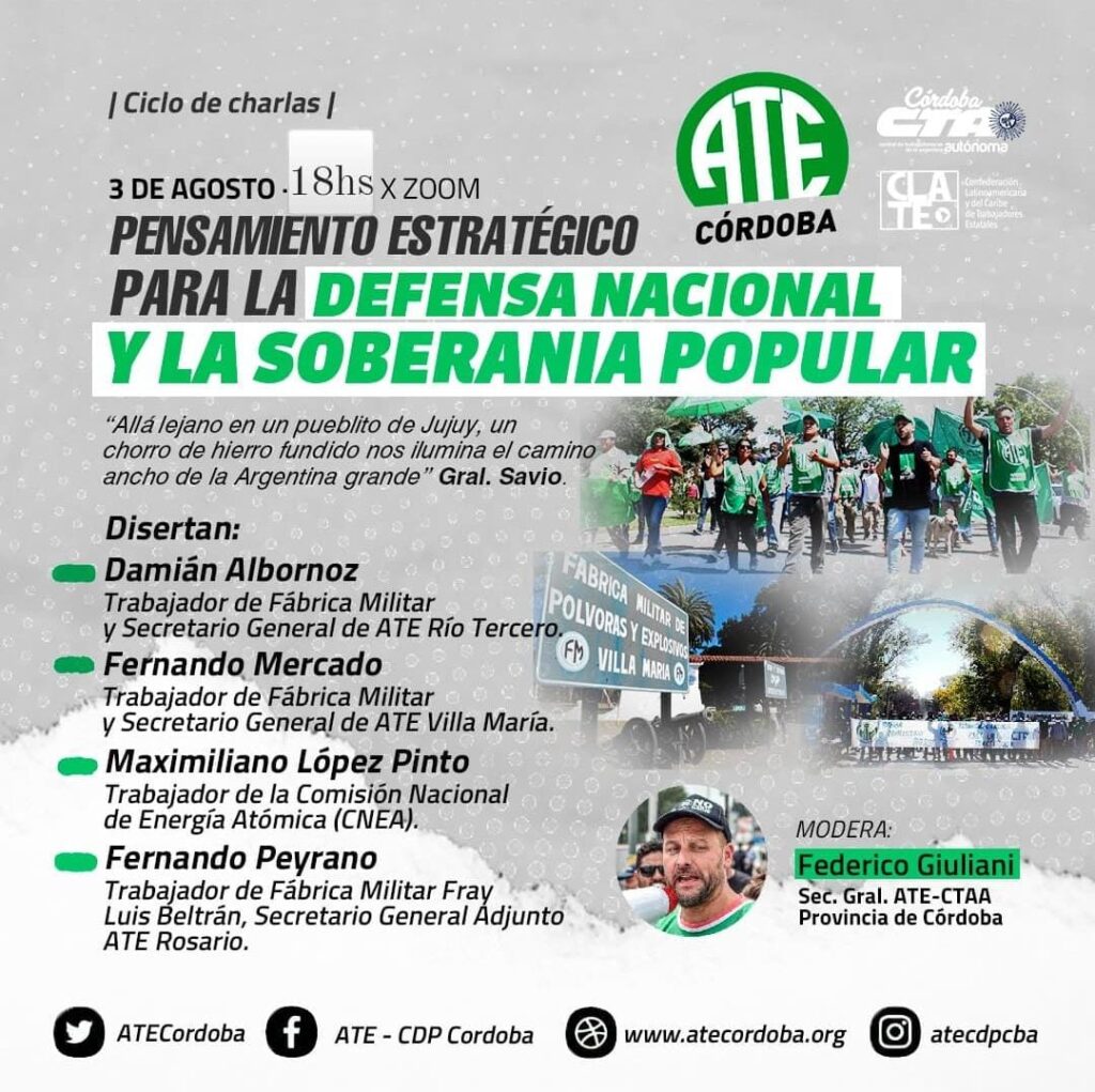 El papel de los trabajadores para definir ese rumbo es fundamental y para eso, con la coordinación del secretario General de ATE Córdoba, Federico Giuliani, estarán disertando el secretario Adjunto de ATE Rosario y trabajador de la Fábrica Militar Fray Luis Beltrán, Fernando Peyrano, el secretario General de ATE Villa María, Fernando Mercado, y su par de ATE Río Tercero, Damián Albornoz, junto al trabajador de la Comisión Nacional de Energía Atómica, Maximiliano López Pinto.