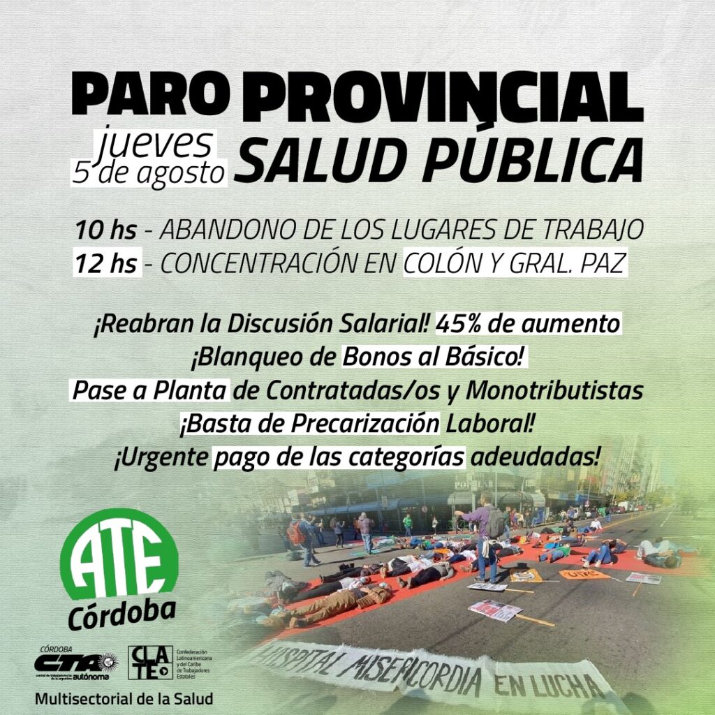 Ante la necesidad de recomponer el salario de los equipos de salud e la Provincia, que vienen perdiendo brutalmente con la inflación de todos los días, frente a la falta de propuestas concretas del Gobierno de Schiaretti para la próxima mesa de discusión salarial, ATE y la Multisectorial de la Salud de Córdoba realizarán el jueves 5 de agosto un paro total de actividades.