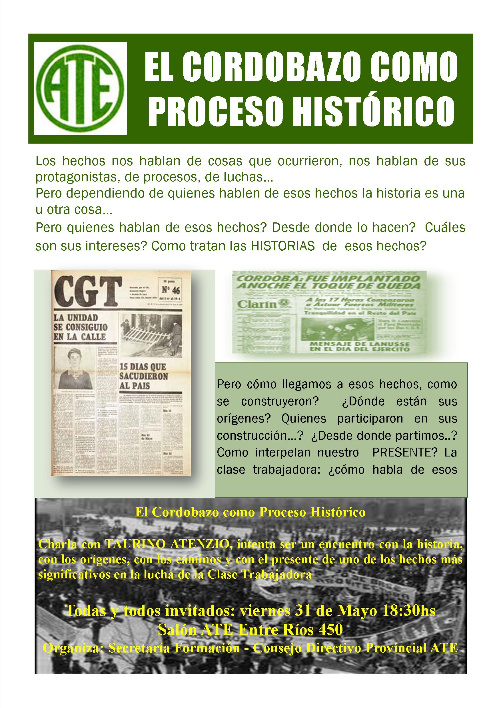 C0n motivo de cumplirse un nuevo aniversario del Cordobazo la Secretaria de Formación del Concejo Directivo Provincial invita a una charla a realizarse el viernes 31 de mayo, a las 18.30 horas, en el salón de ATE, Entre Ríos 450. La convocatoria contará con la presencia del compañero Taurino Atencio.