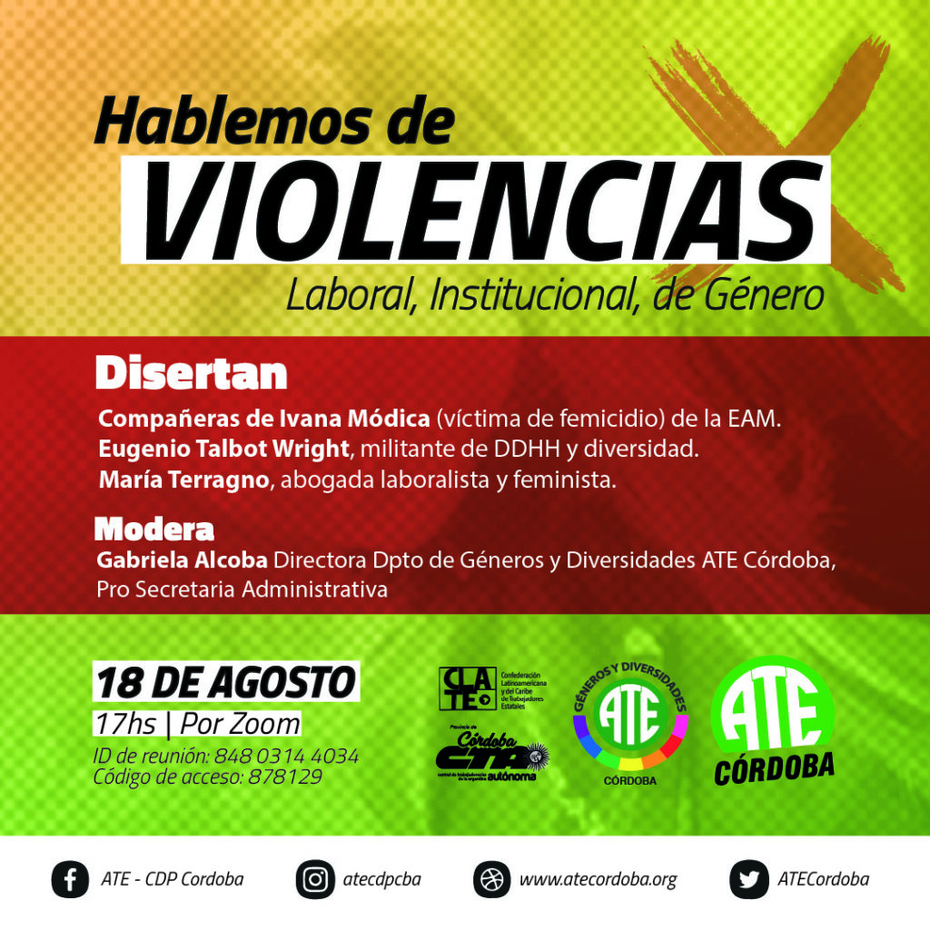 Ayer, ATE Córdoba realizo una charla-debate recordando a Ivana Módica, a 6 meses de su femicidio en manos del Vice Comodoro -y ex-pareja- Javier Galván. La intención era reflexionar acerca de la imperiosa necesidad de conformar ámbitos laborales libres de violencias. De la misma participaron Carolina Llanos y Noelia Martino, de la Guarnición Aérea Córdoba y la Escuela de Aviación Militar; Eugenio Talbot y Gabriela Alcobas, del Departamento de Géneros y Diversidades de ATE Córdoba; y María Terragno, abogada del Consejo Directivo Provincial de ATE Córdoba.