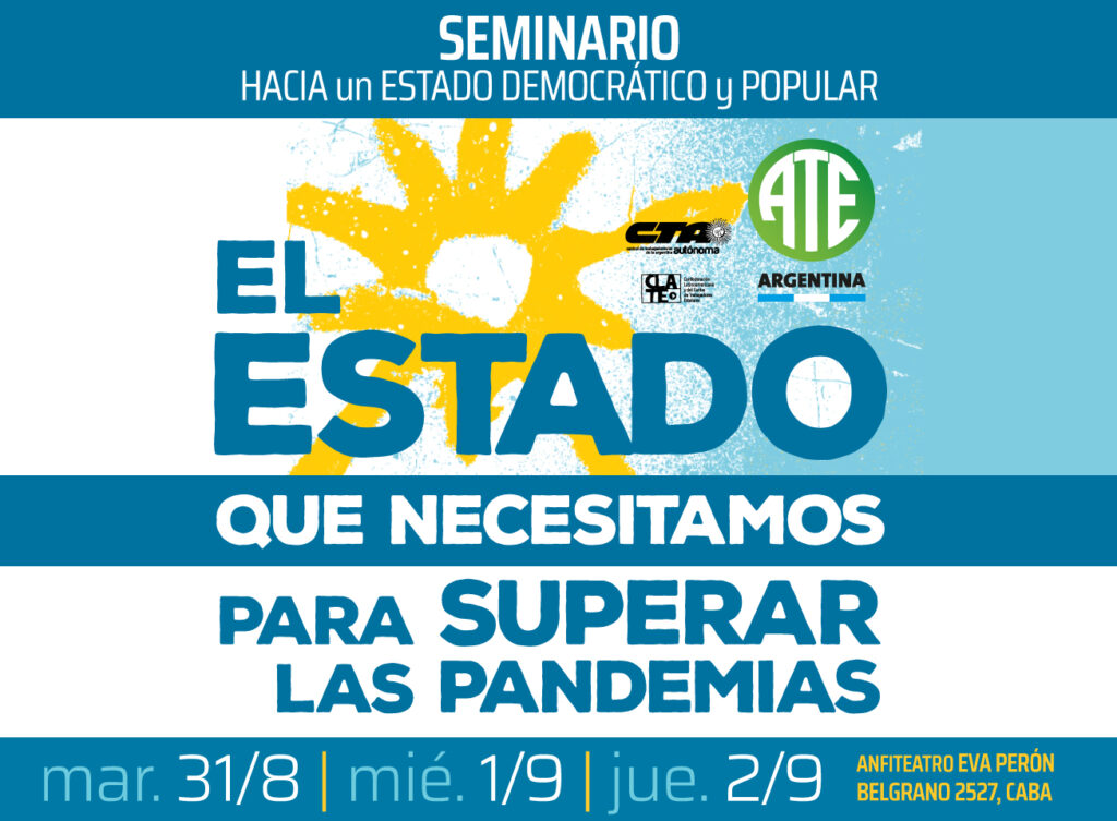 Este 31 de agosto, y 1 y 2 de septiembre, en el Anfiteatro Eva Perón de ATE Nacional (Av. Belgrano 2527, CABA), se llevara cabo el Seminario «El Estado que necesitamos para superar las pandemias: Hacia un Estado democrático y popular». Las jornadas se trasmitirán en vivo por las redes sociales de ATE Nacional, y cientos de compañerxs de todo el país participaran mediante teleconferencia.