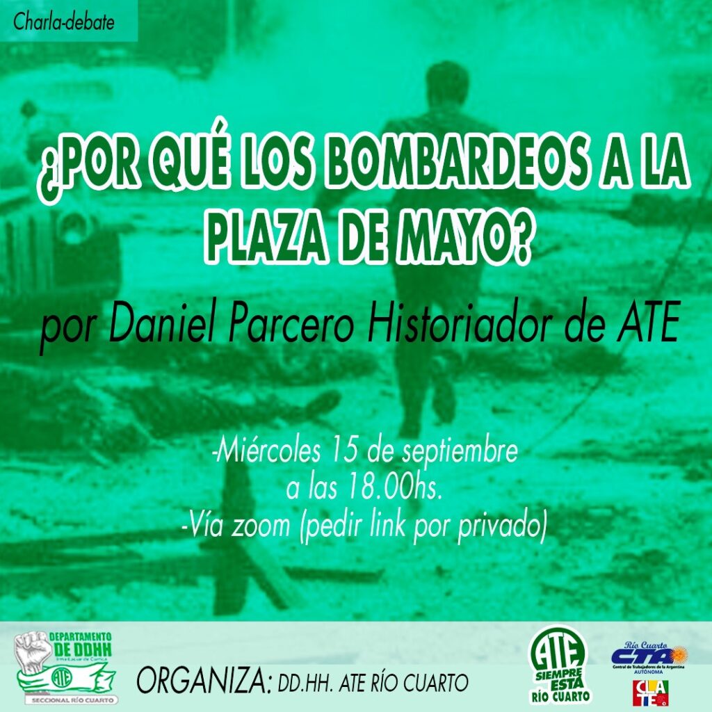 El Departamento de Derechos Humanos “Irma Laciar de Carrica” de la Asociación Trabajadores del Estado (ATE-CTA) Seccional Río Cuarto, organiza mañana 15 de septiembre de las 18 horas vía Zoom una charla-debate a cargo del historiador Daniel Parcero sobre el Golpe Contrarevolucionario de 1955.