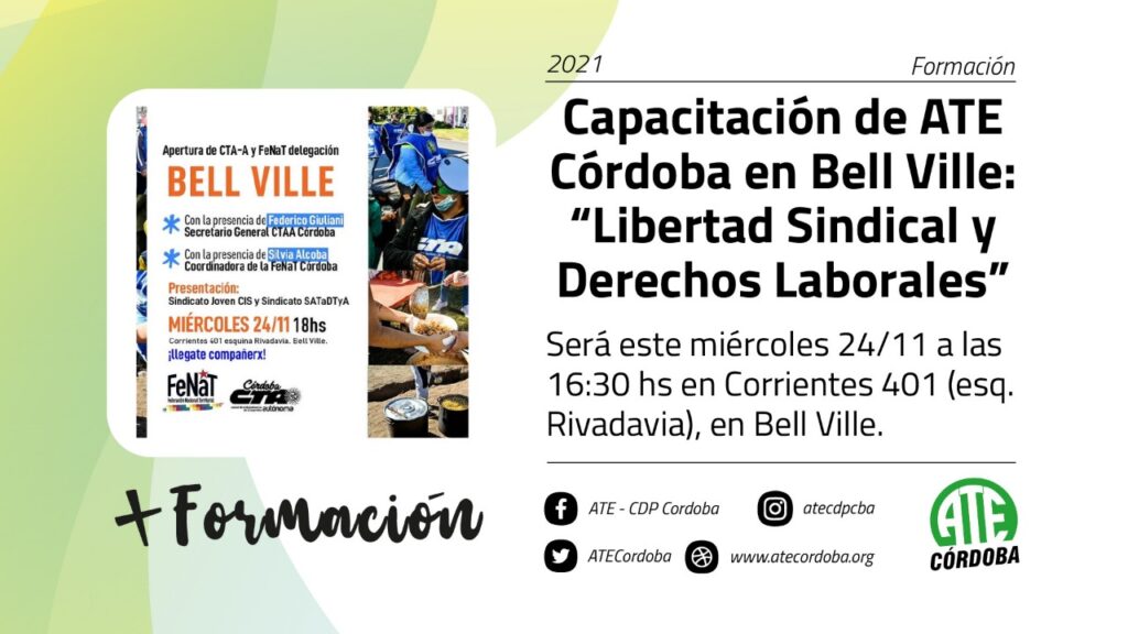En el marco del nuevo impulso a la sede sindical, desde ATE Córdoba se organizó, también, una formación sindical para trabajadoras y trabajadores municipales, provinciales y nacionales, que tuvo como eje la “libertad sindical y los derechos laborales”. César Theaux fue el responsable de llevarla adelante