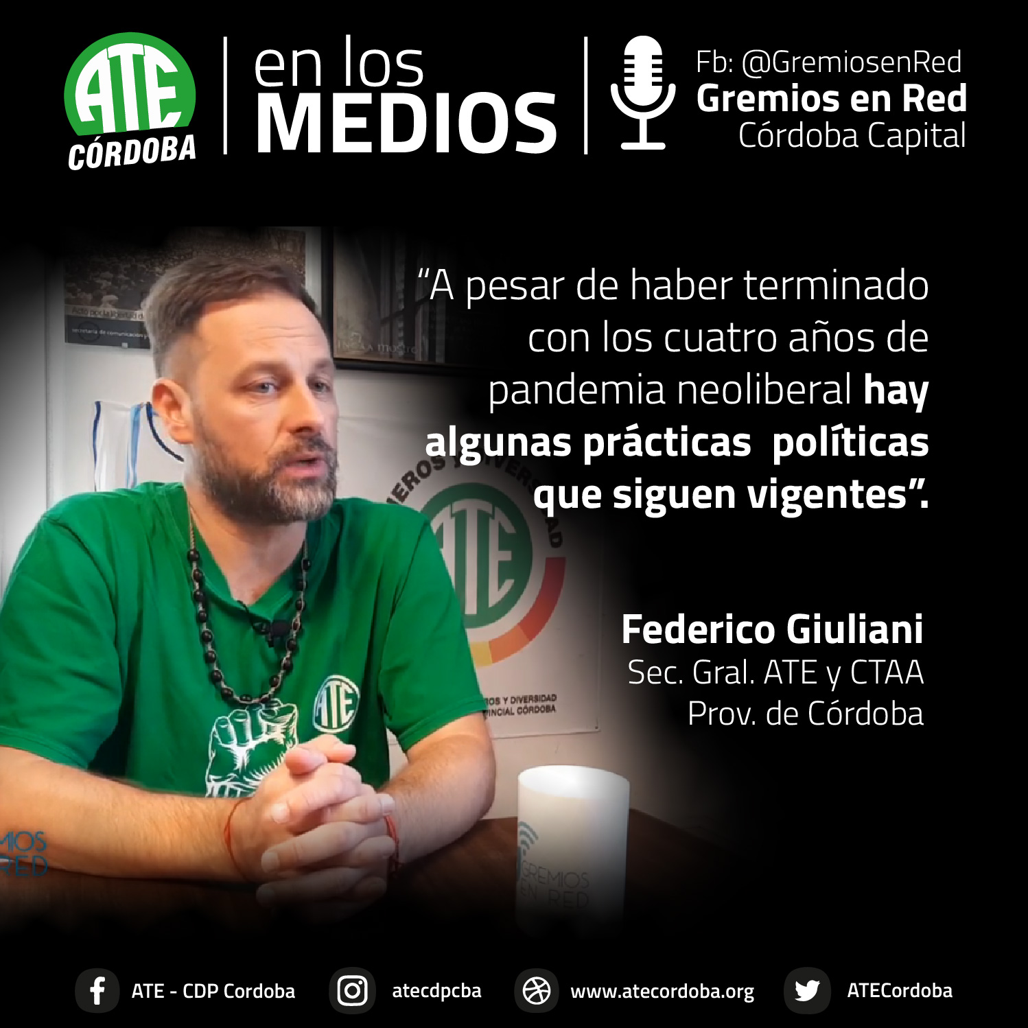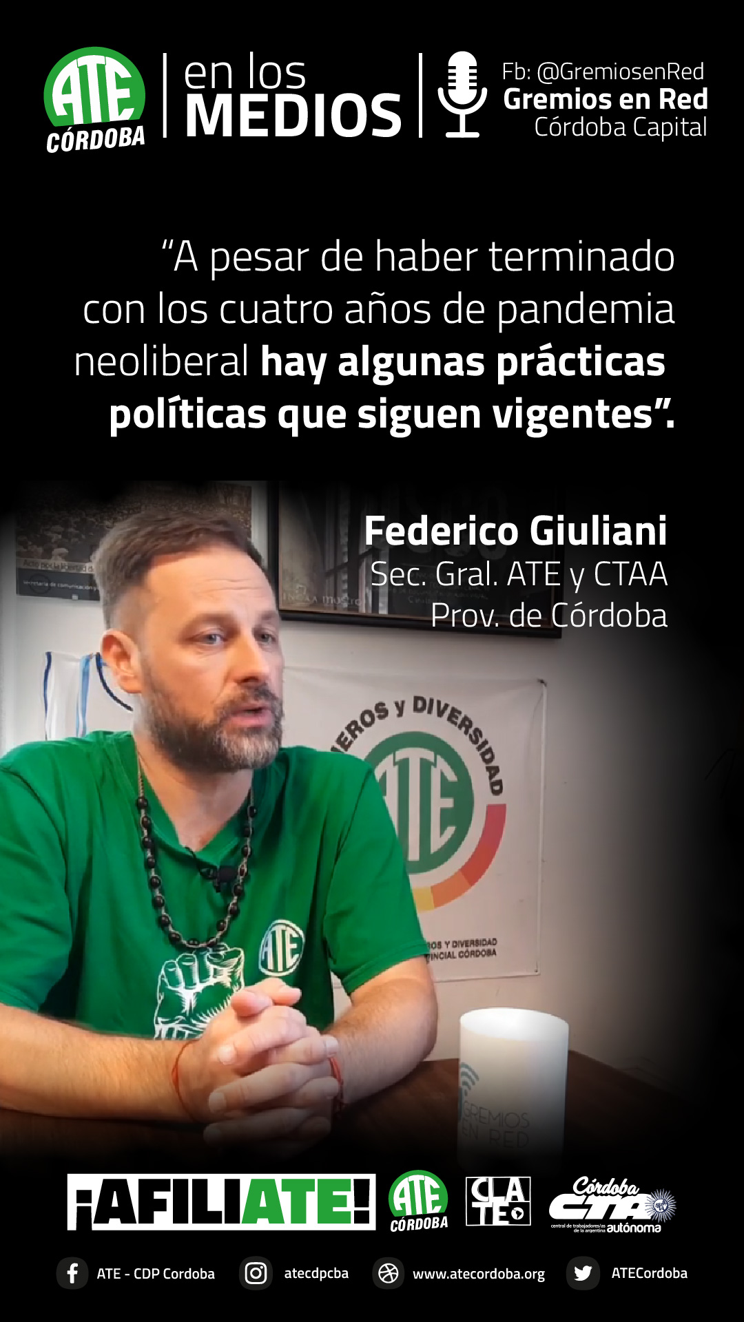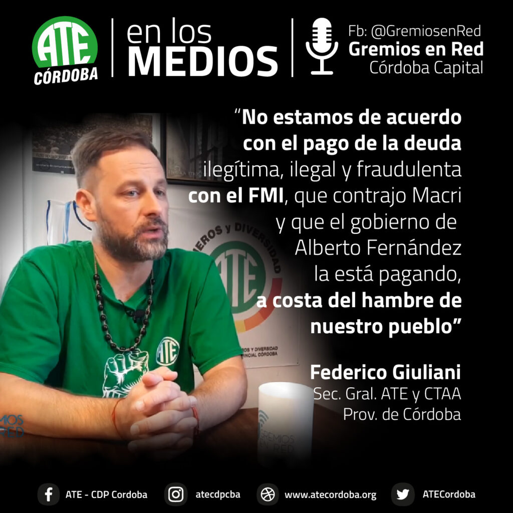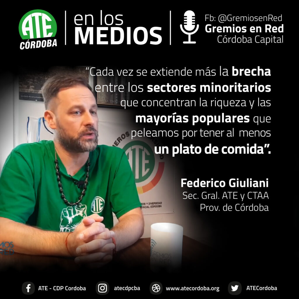 En una entrevista que concedió al portal Gremios en Red, el secretario General de ATE Córdoba, Federico Giuliani, lanzó definiciones sobre la coyuntura que atraviesa la clase trabajadora, tras dos años de pandemia sanitaria y cuatro de pandemia neoliberal macrista.