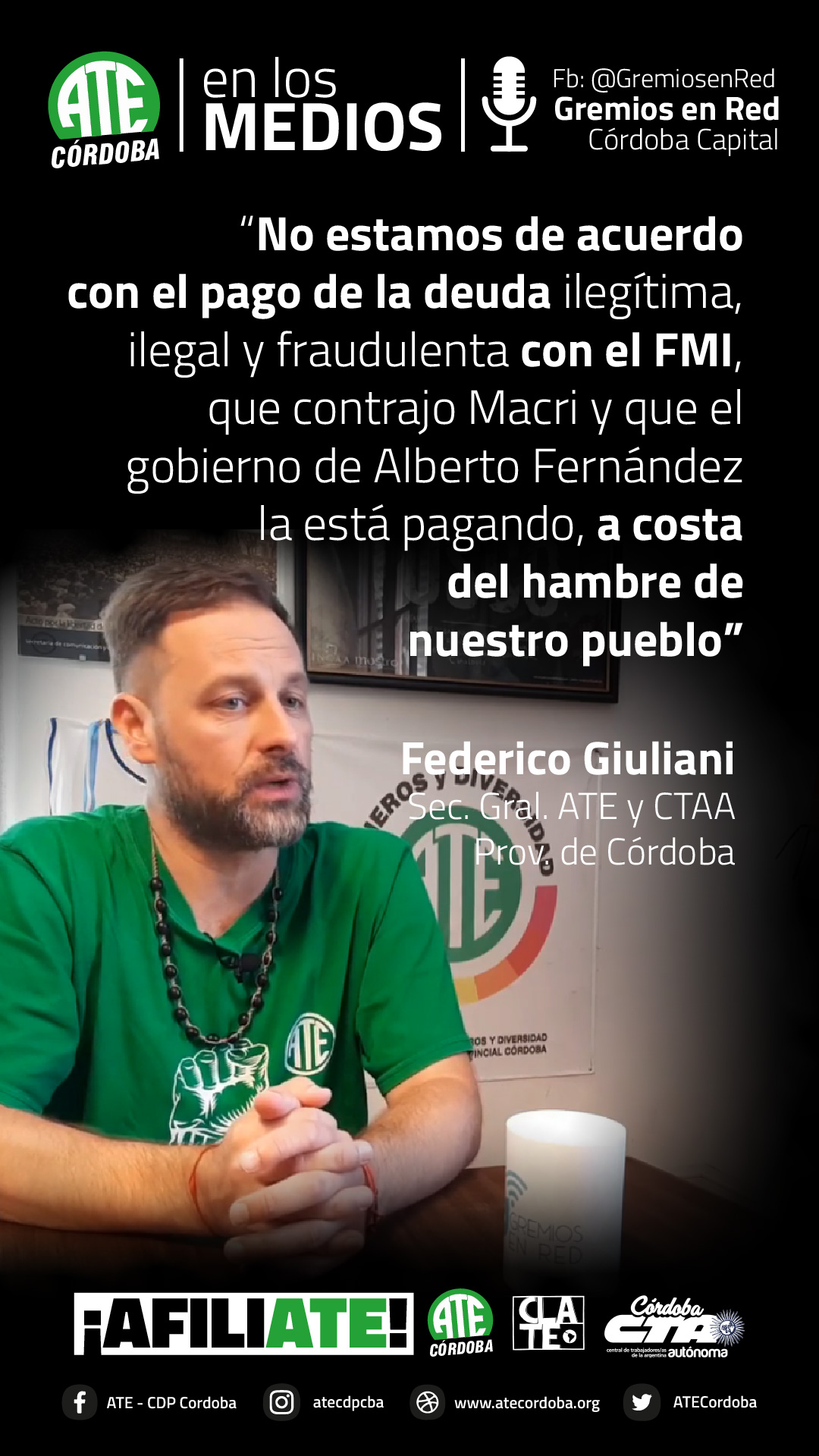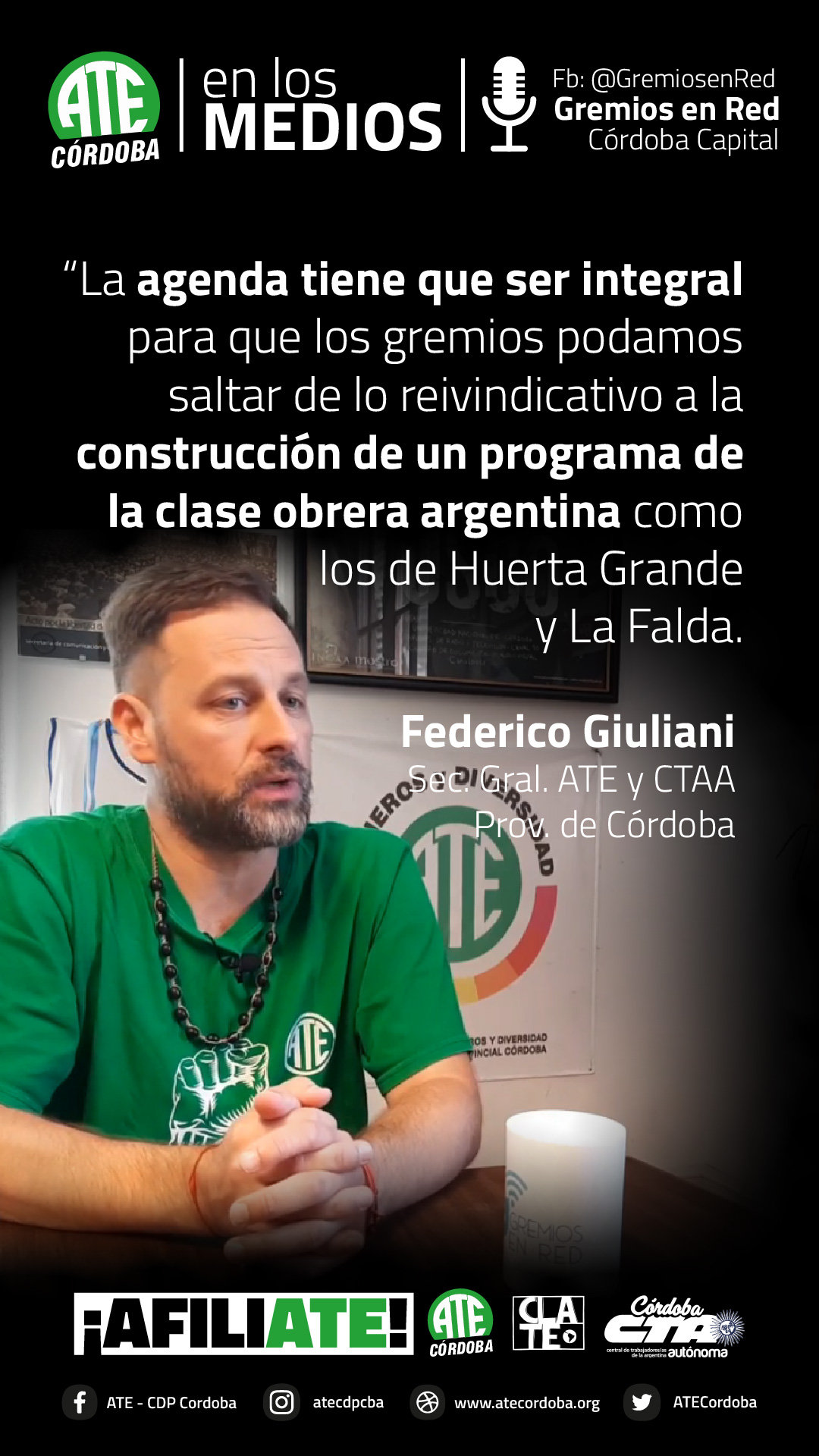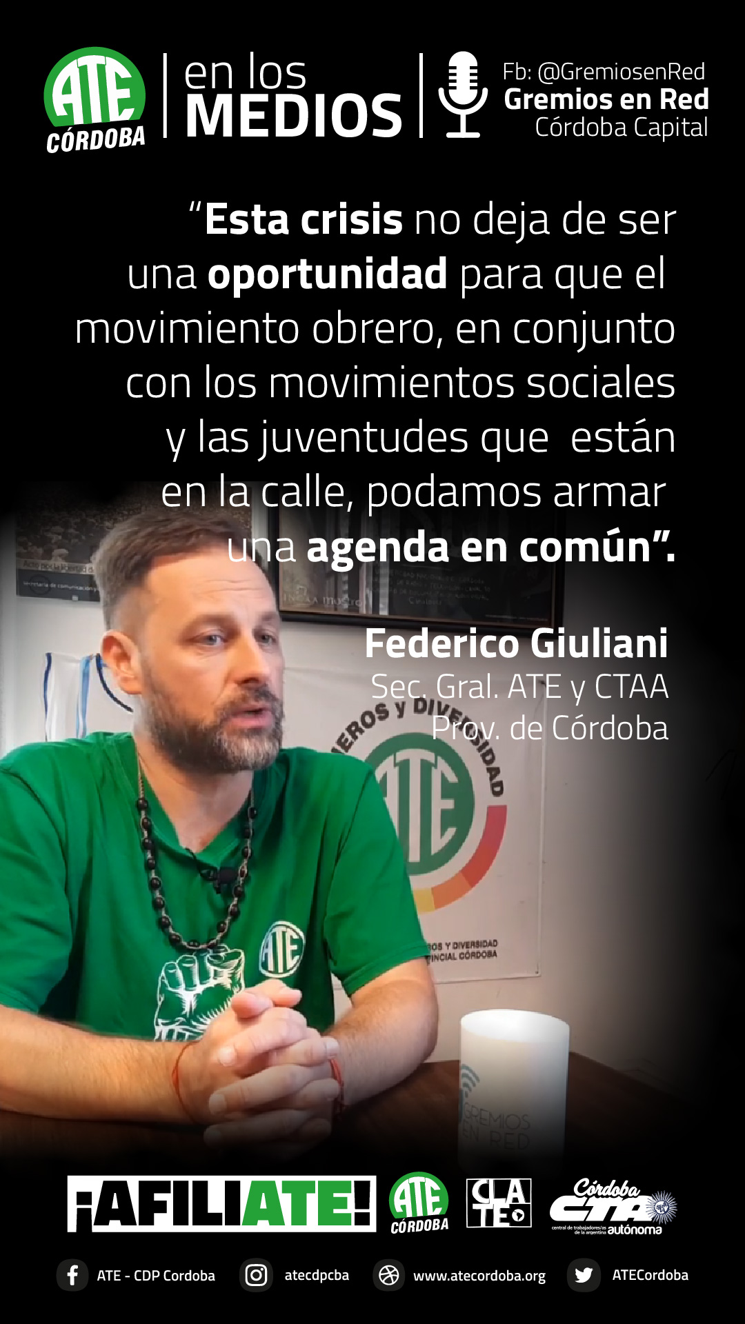 En una entrevista que concedió al portal Gremios en Red, el secretario General de ATE Córdoba, Federico Giuliani, lanzó definiciones sobre la coyuntura que atraviesa la clase trabajadora, tras dos años de pandemia sanitaria y cuatro de pandemia neoliberal macrista.