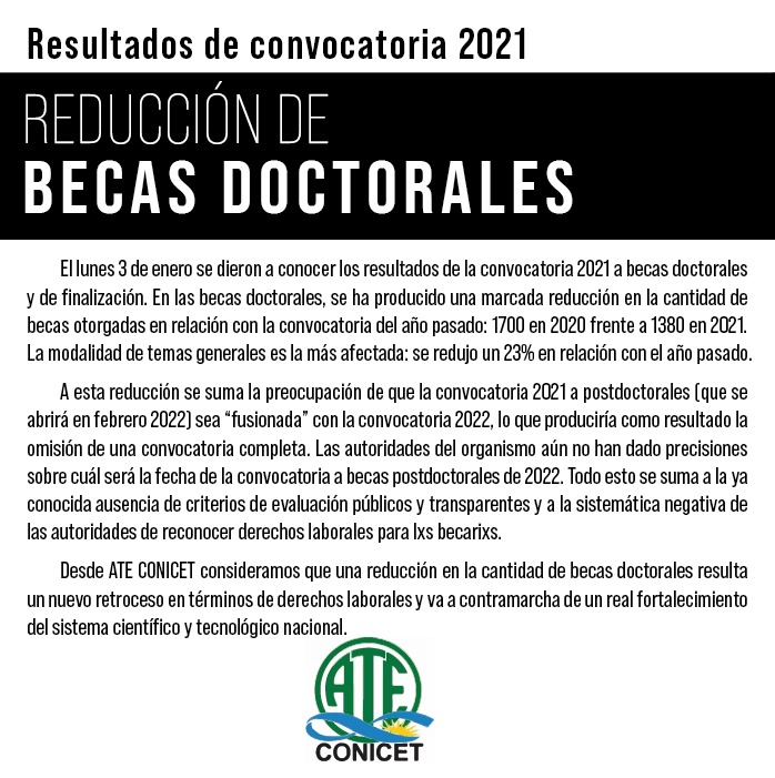 “Desde ATE Conicet consideramos que la reducción en la cantidad de becas doctorales resulta un nuevo retroceso en términos de derechos laborales y va a contramarcha de un real fortalecimiento del sistema científico y tecnológico nacional“, concluyeron.