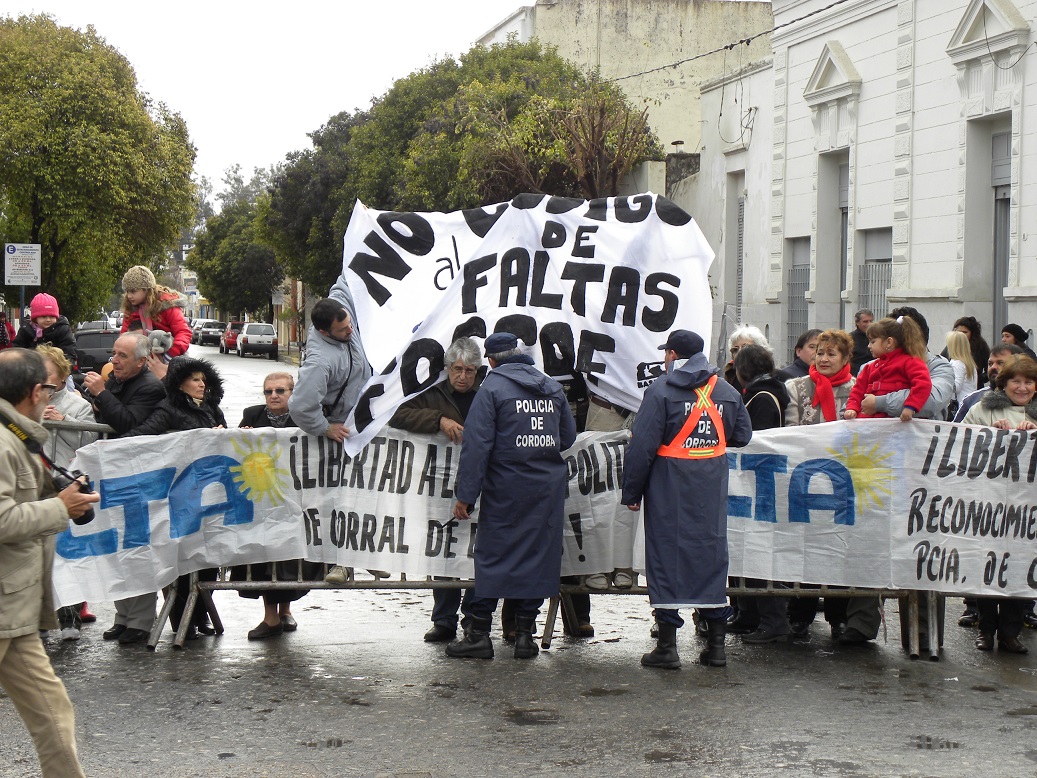 Se trató de un acto de protesta frente al gabinete provincial en pleno, a falta de la presencia del gobernador De la Sota. Integrantes de varias organizaciones reclamaron al Gobierno de Córdoba por tres puntos: la derogación del Código de Faltas, la libertad de los detenidos por la pueblada de Corral de Bustos y el reconocimiento del ámbito de representación de la Asociación de Trabajadores del Estado (ATE-CTA).