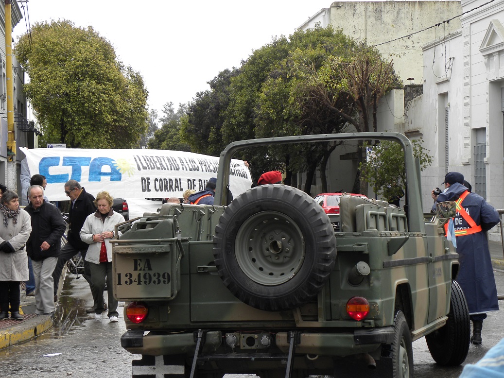 “Uno, por la libertad de los presos políticos, que son los seis detenidos por la pueblada de Corral de Bustos. La verdad, es que la Justicia establece que pueden estar en libertad los que no tienen condena firme, pero la Justicia de Córdoba, en complicidad con el poder político, decide no liberar a nadie abusando de la prisión preventiva para disciplinar socialmente”, indicó Oscar Mengarelli. Acompañaron ese reclamo los familiares de los detenidos en la cárcel de Villa María, que tienen apoyo no sólo de la CTA, sino de otras organizaciones de derechos humanos nacionales e internacionales.