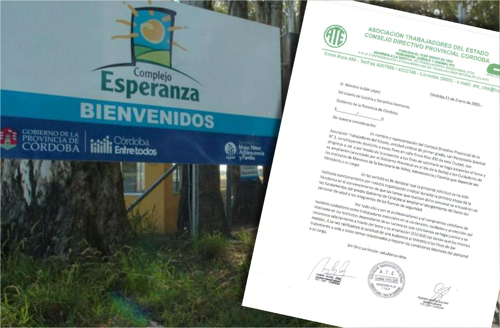 Tras el anuncio -el día 10 de enero- de 5 mil pesos de aumento en el bono que cobran las trabajadoras/es de la salud y la seguridad provincial, ATE Córdoba solicitó que se haga extensivo el bono y su ampliación a las y los Cuidadores de los Institutos de Menores de la Secretaría de Niñez, Adolescencia y Familia (SENAF) del Ministerio de Justicia y Derechos Humanos del Gobierno de la Provincia de Córdoba. “Es de destacar -expresaron ayer en una misiva dirigida al ministro Julián López- que la presente solicitud ya ha sido realizada oportunamente por nuestra organización sindical durante la primera etapa de la pandemia, en el convencimiento de que las tareas que realiza dicho personal se encuadran en los fundamentos del propio Gobierno de Córdoba al ampliar el otorgamiento del bono del personal de salud a los integrantes de las fuerzas de seguridad”.