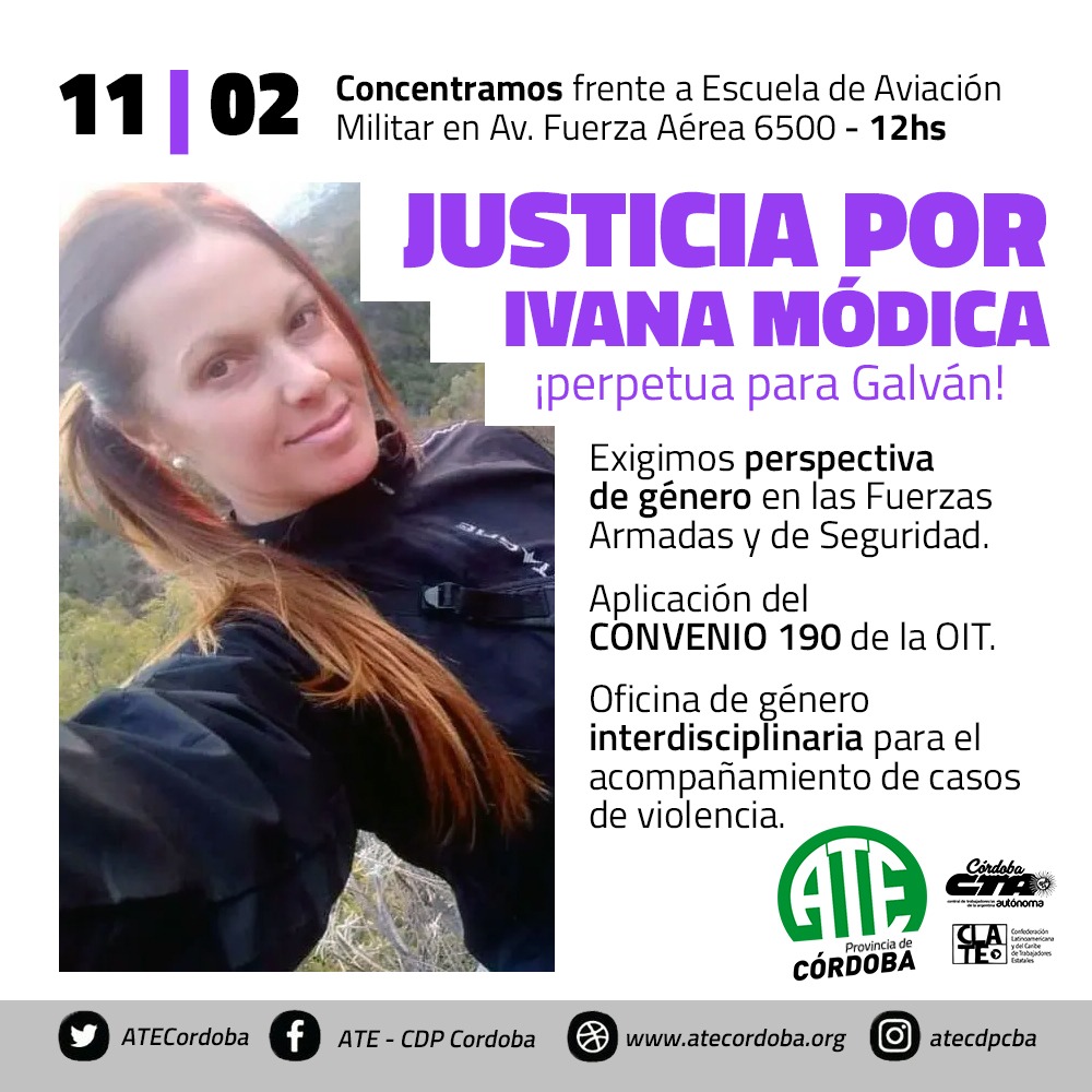 El próximo viernes 11 de febrero a las 12 horas, ATE convoca a movilizarse en homenaje a Ivana Modica, trabajadora de la Escuela de Aviación Militar (EAM) y victima de feminicidio cometido por el su pareja, el vicecomodoro de la Fuerza Aérea Javier Galvan.