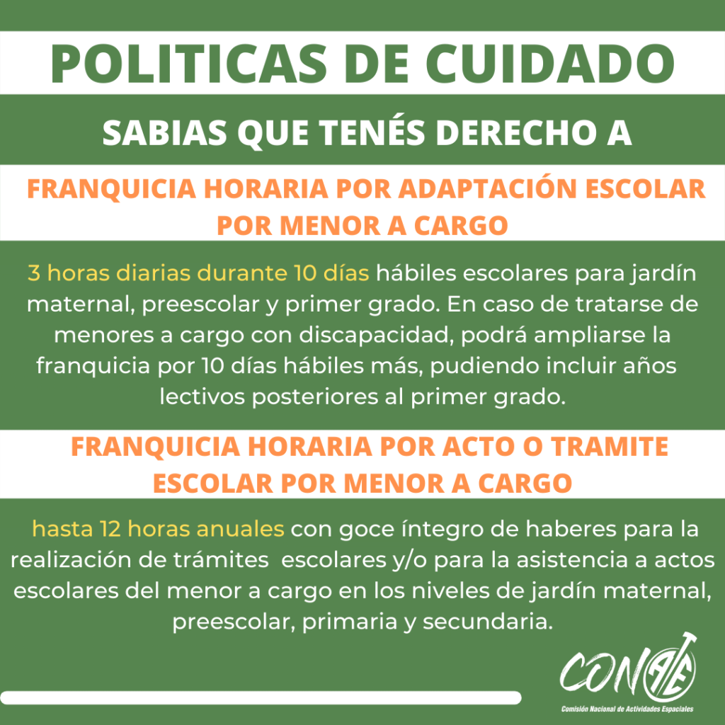 Las y los trabajadores de la Comisión Nacional de Actividades Espaciales (CONAE) tienen disponible para el comienzo del periodo escolar de sus hijas e hijos la franquicia horaria “por adaptación escolar de menor a cargo”.
