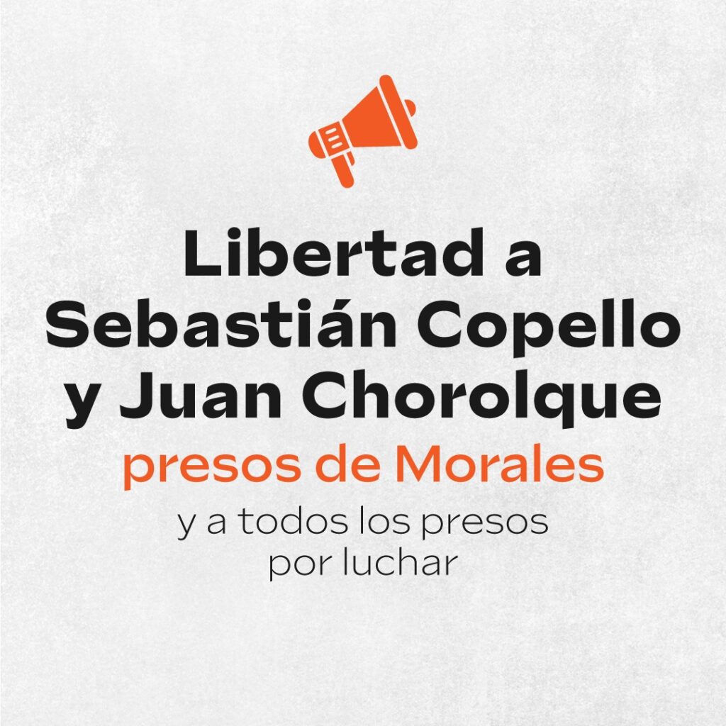Exigimos la libertad inmediata de Sebastián Copello (Polo Obrero) y Juan Choroloque (MTR 12 de abril) encarcelados arbitrariamente ayer por orden directa del gobernador Morales en la provincia de Jujuy. La “Justicia”, que es un títere del Poder Ejecutivo provincial, avanza en la criminalización de la protesta social. Se trata de un hecho gravísimo: los Gobiernos responsables de un récord histórico de pobreza atacan a quienes reclaman por las condiciones materiales de vida elementales para su subsistencia, como alimentos para comedores y trabajo genuino. Hoy el Estado queda al desnudo y solo muestra la coerción y la represión para acallar los reclamos y de esta manera implementar un ajuste que aumente las ganancias de los monopolios para que todo el régimen político cumpla con el acuerdo con el Fondo Monetario Internacional y la deuda usurera que condiciona nuestra soberanía popular.